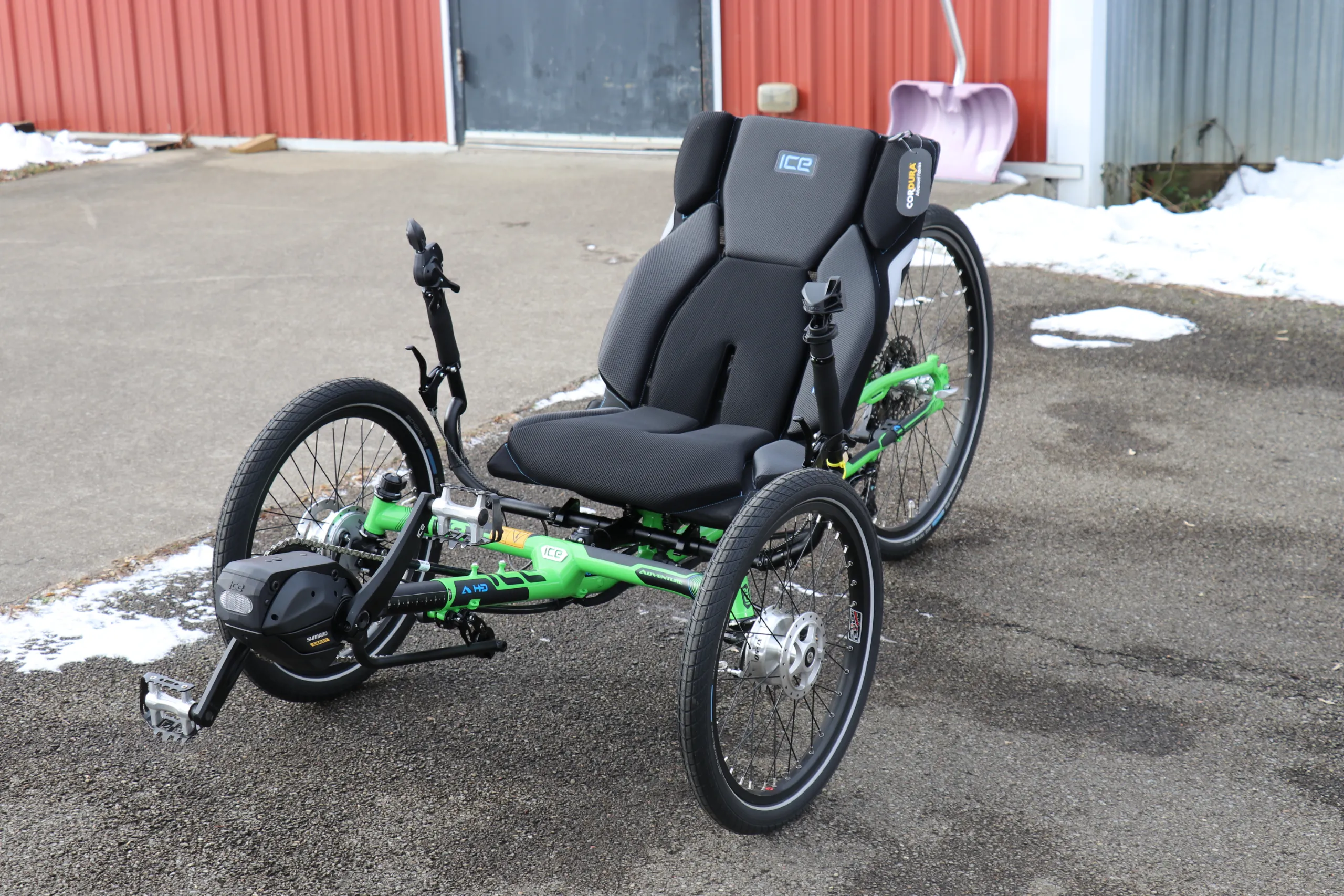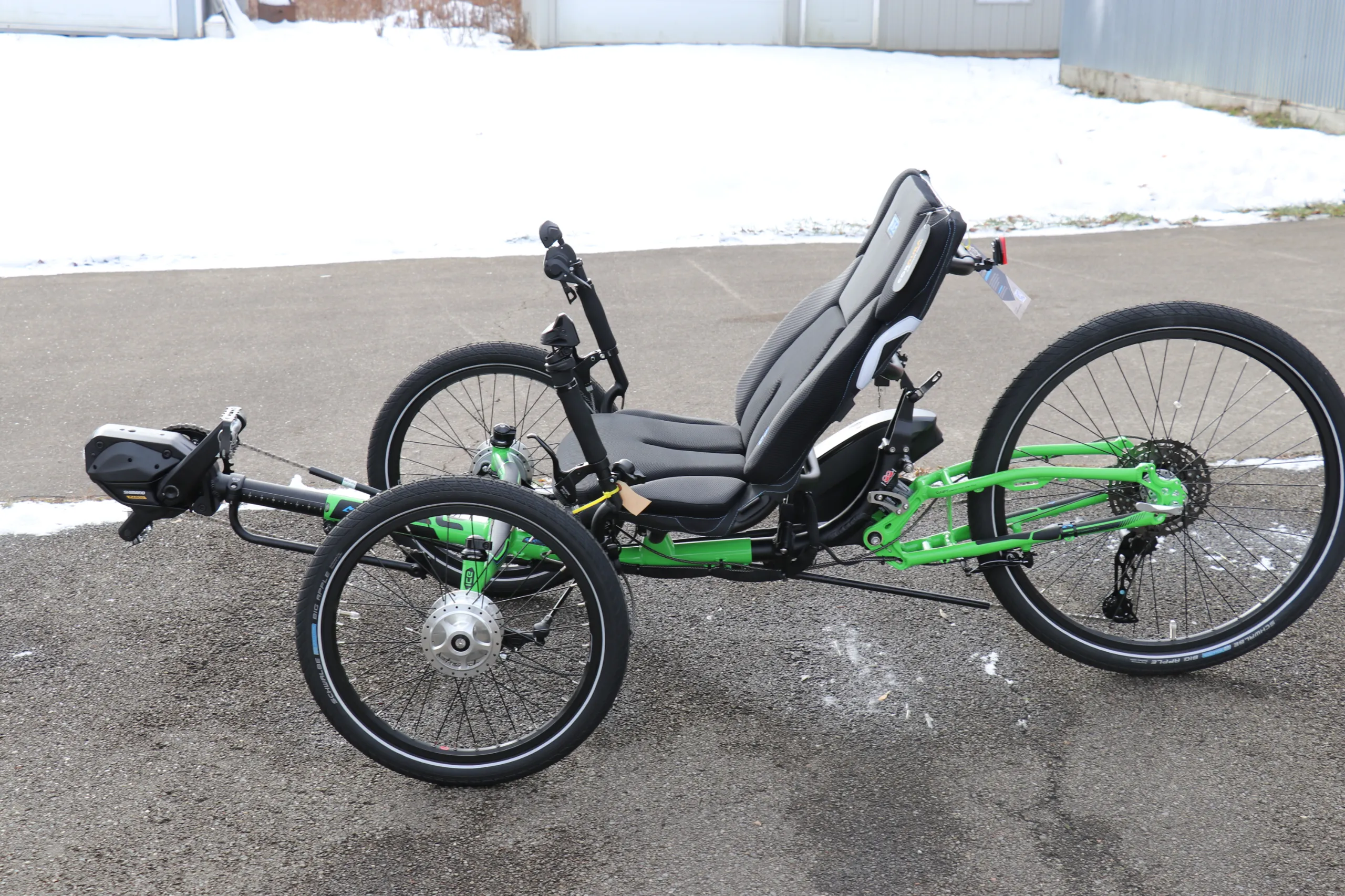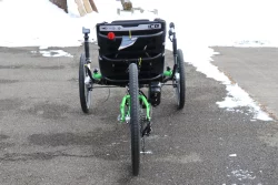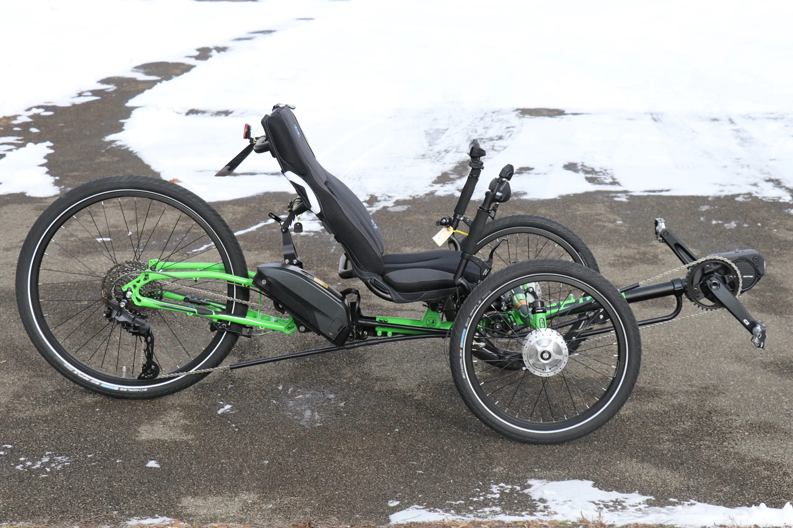 This trike is equipped with the Shimano Steps EP6 Cargo motor, 630wh battery, and Shimano Cues drivetrain.