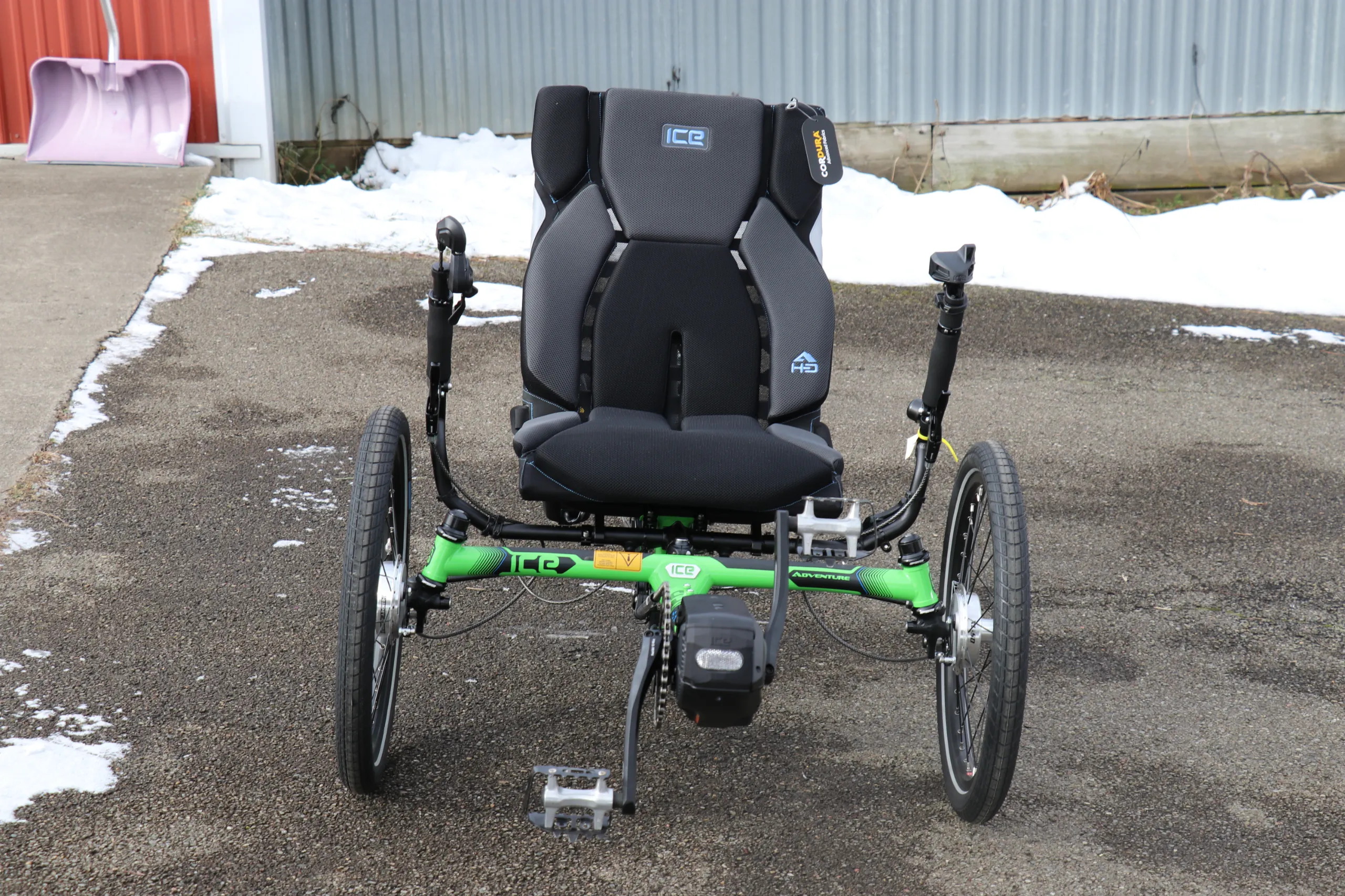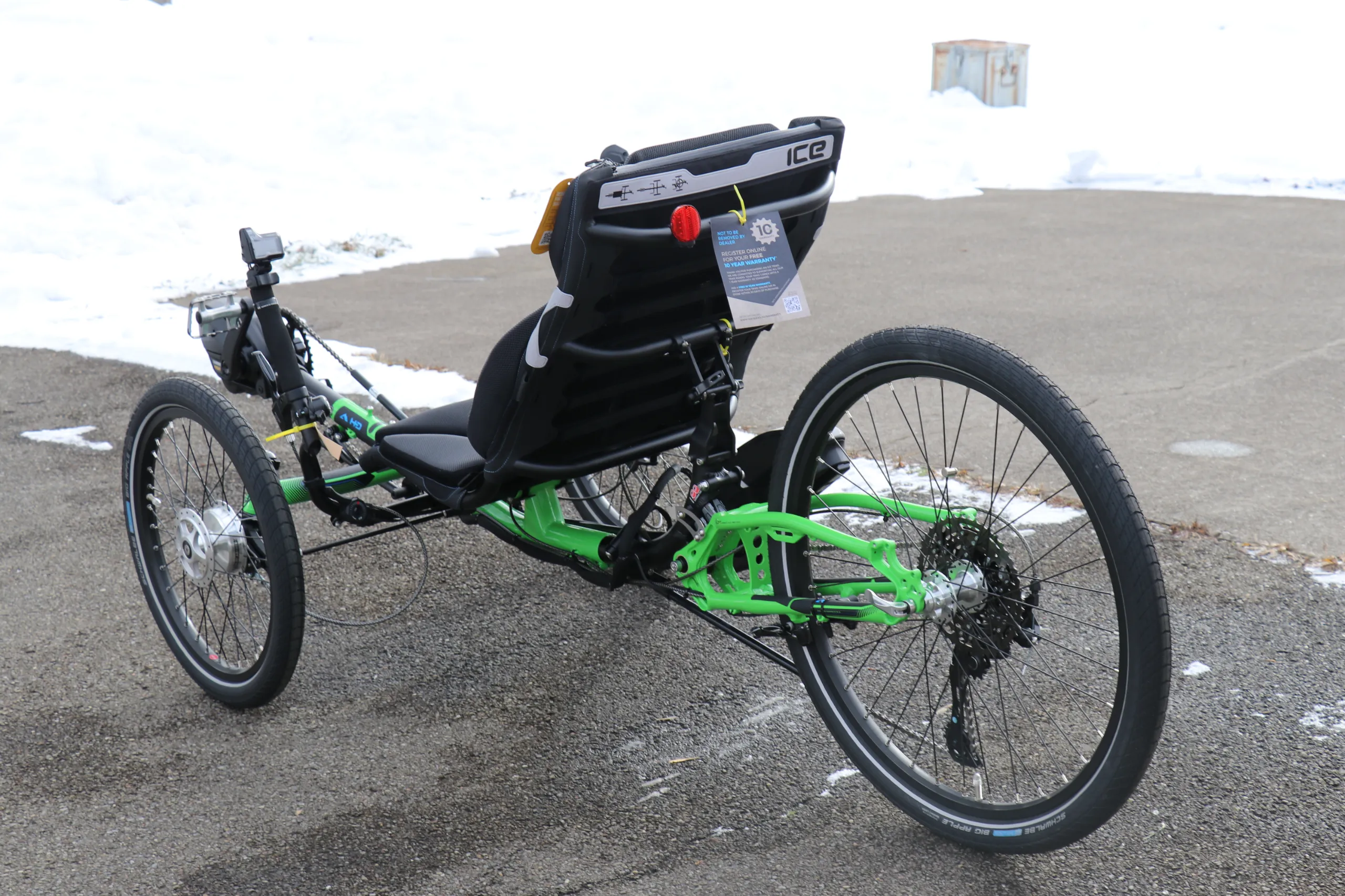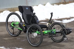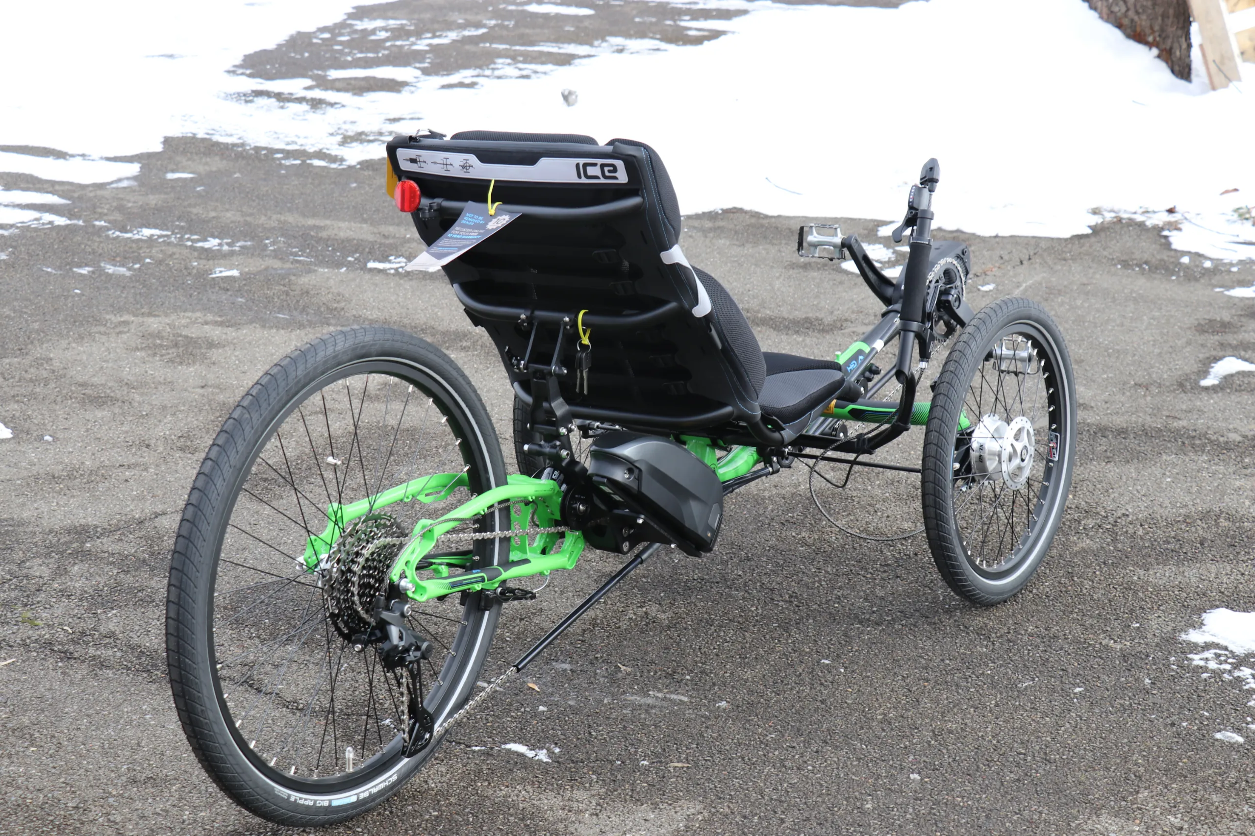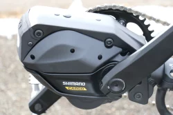 This trike is equipped with the Shimano Steps EP6 Cargo motor, 630wh battery, and Shimano Cues drivetrain.
